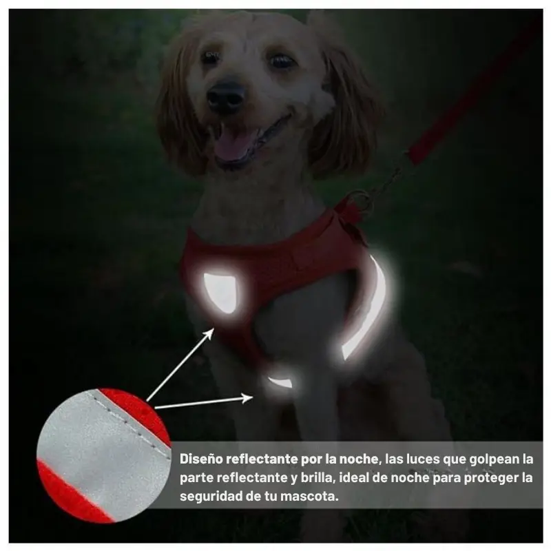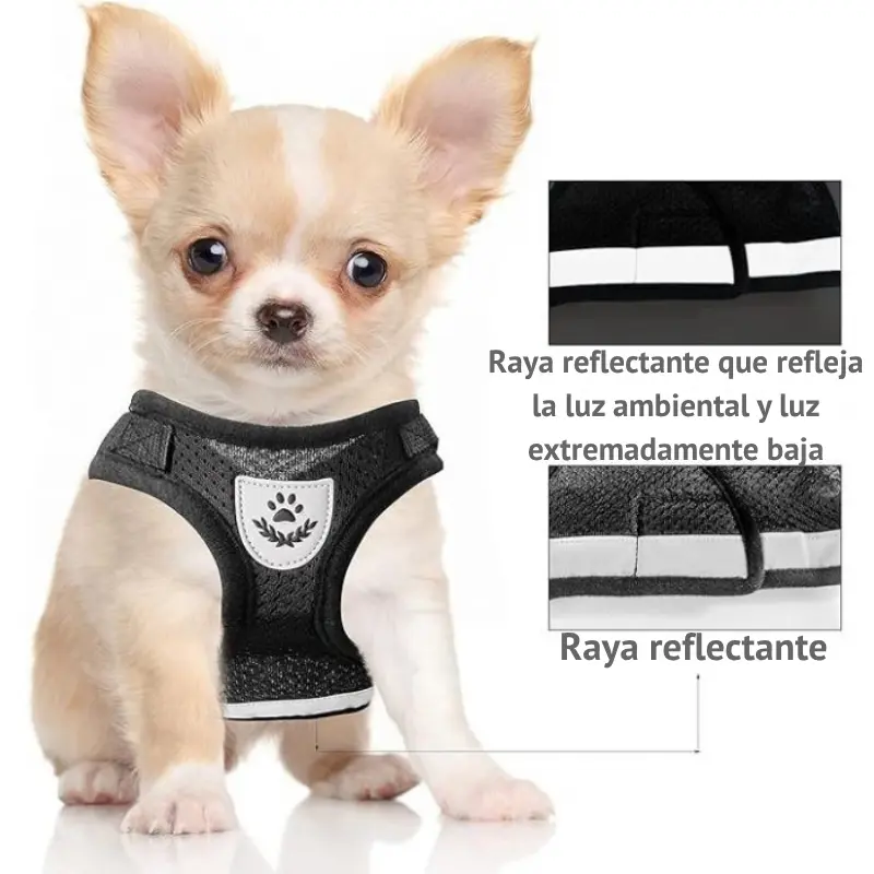 🔹 Fabricado con materiales resistentes y suaves, este arnés distribuye la presión de forma uniforme en el pecho de tu mascota, evitando tirones o molestias en el cuello.