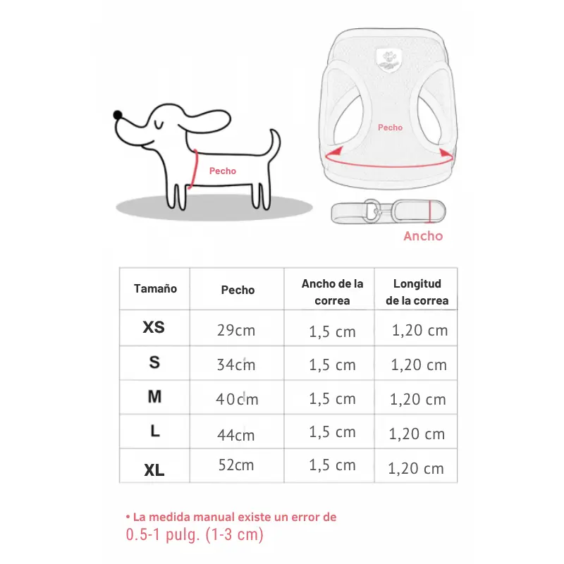 | Talle | Pecho | Ancho de la correa | Longitud de la correa |