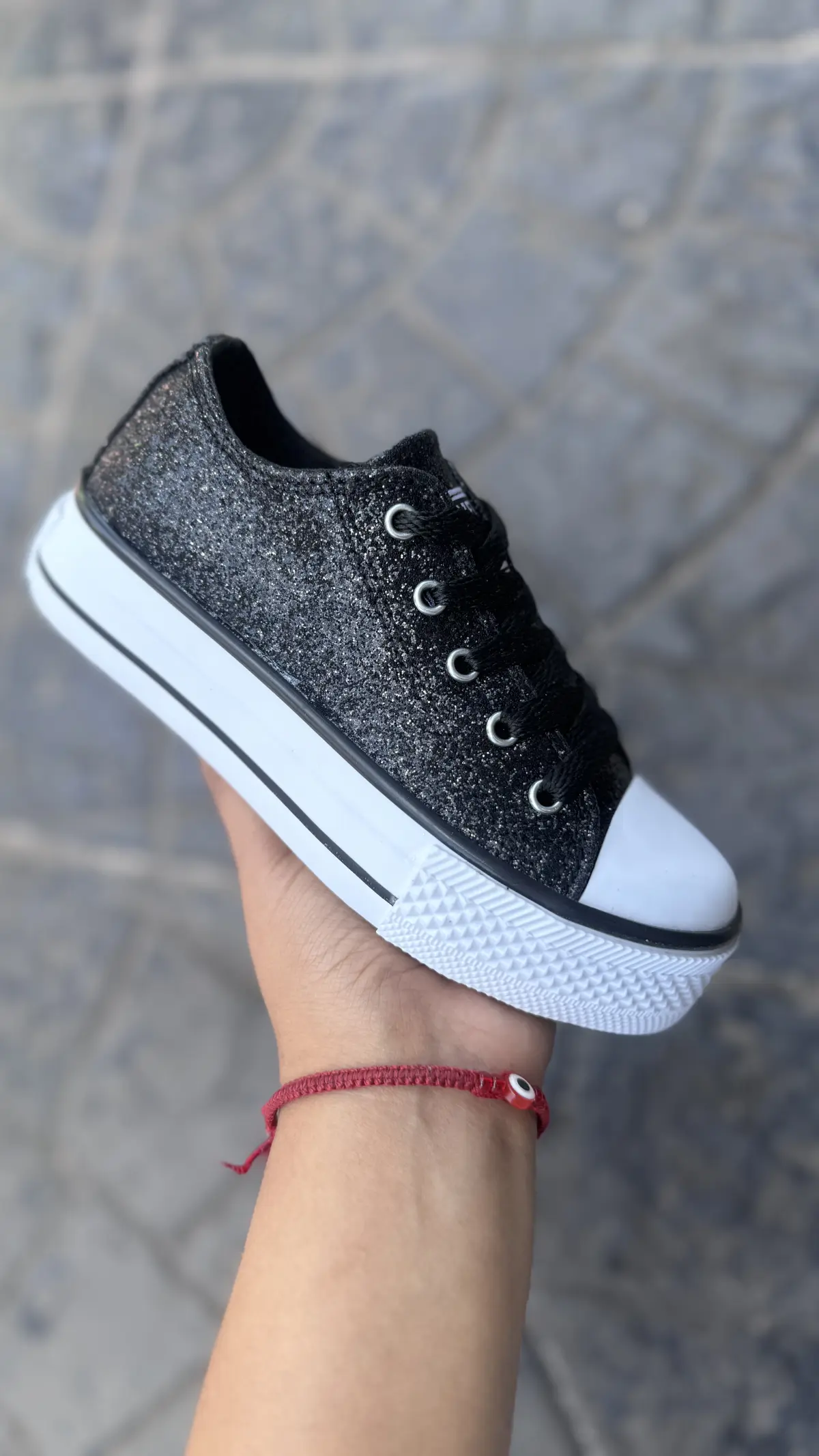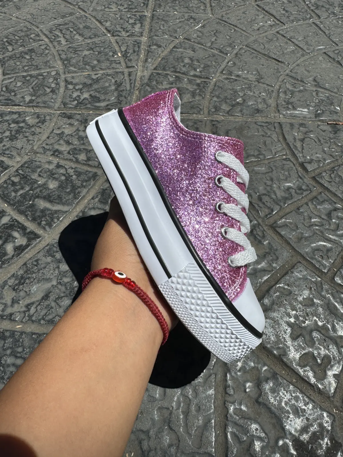 👟 Inspiradas en el icónico modelo Converse, estas zapatillas se reinventan con acabado glitter brillante disponible en tonos fucsia, negro, plateado y rosa, ideales para elegir según su estilo.